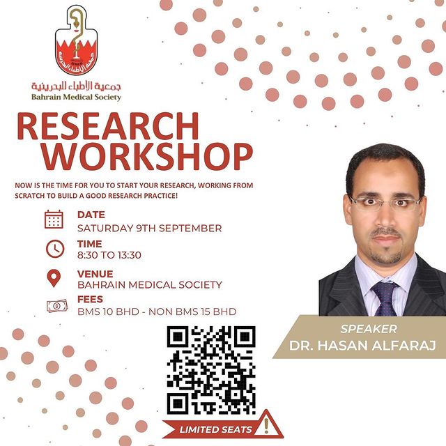 Bahrain Medical Society is delighted to announce you for its *SMLE Workshop* ๐ค Speaker : *Dr. Rawan Engineer* Qualifications: MBBS, SMLE, GP, Mentorship program in Women Surgeon Kuwait. ๐๏ธ Mark your calendar for *Wednesday 20th of December 2023* โฐ Time: *5:30-7:30 PM* (Bahrain time). ๐ป Zoom Meeting. ๐ธ Fees: *5 BD* for All